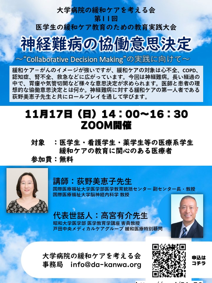 大学病院の緩和ケアを考える会主催のオンライン研修会です。「神経難病の協働意思決定」~“Collaborative Decision Making”の実践に向けて~ 緩和ケア=がんのイメージが強いですが、緩和ケアの対象は心不全、COPD、認知症、腎不全、救急などに広がっています。今回は神経難病。長い経過の中で、胃瘻や気管切開など様々な意思決定が求められます。医師と患者の理想的な協働意思決定とは何か。神経難病に対する緩和ケアの第一人者である荻野美恵子先生と共にロールプレイを通して学びます。是非、ご参加を!